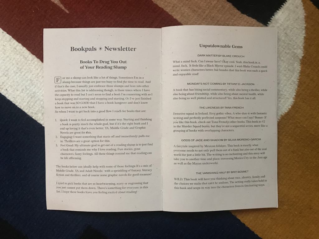 A Newsletter that comes to your mailbox instead of your inbox! I realized in 2020 how much I love getting snail mail that isn’t an advertisement or a bill. I made BookPals as a way to connect with other readers and create something fun. They’re written & bound by me, designed by my partner, and sent out with a whole lot of love (and stickers).